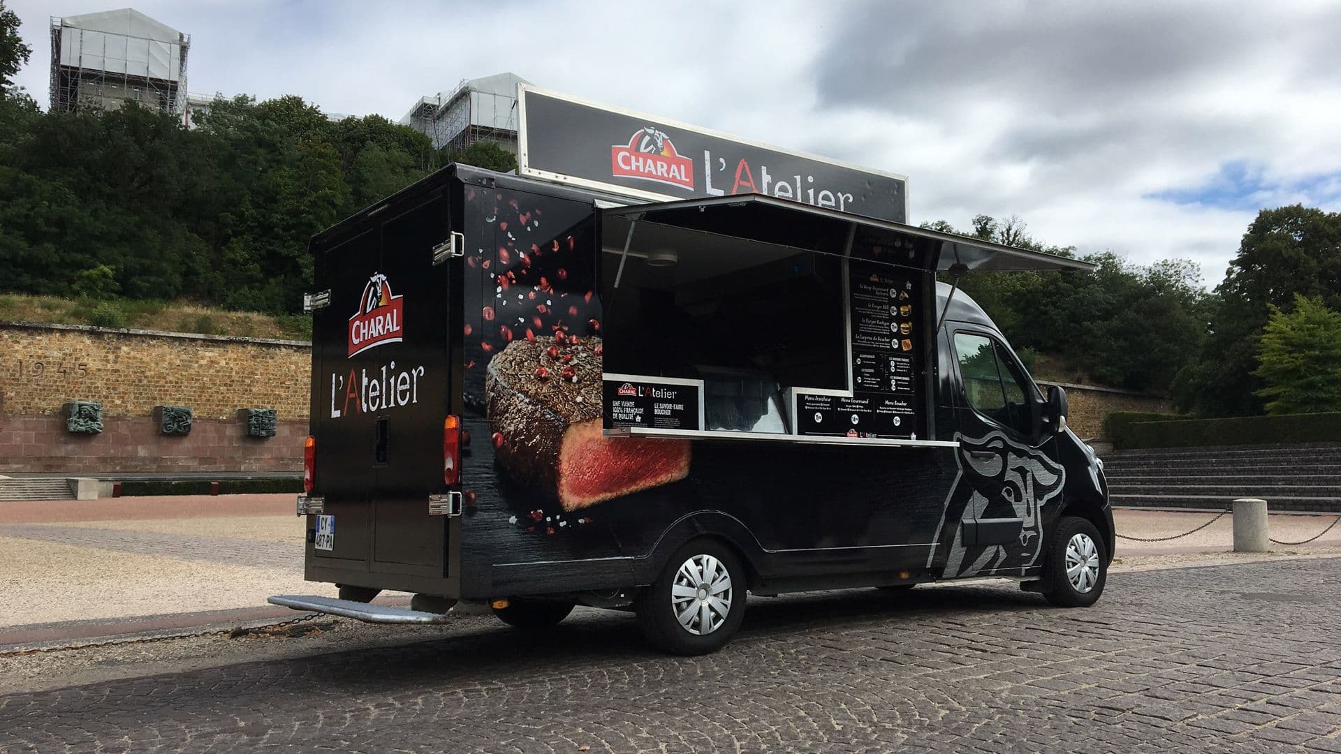 Fuselage de Falcon 50 fixé sur une remorque plateau de fabrication Van Barbot et aménagé en food-truck. Homologué pour la route et la cuisine. Double prise camp
